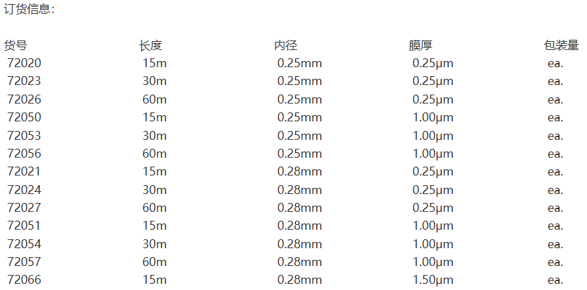 中等极性固定相。Crossbond 14%氰丙基苯基/86%二甲基聚硅氧烷 通用性色谱柱。可用于酒精饮料、氧化物、多氯联苯类、杀虫剂的分析 温度范围:-20°C - 280°C 相当于USP G46固定相 相似固定相:DB-1701、HP-1701、SPB-1701