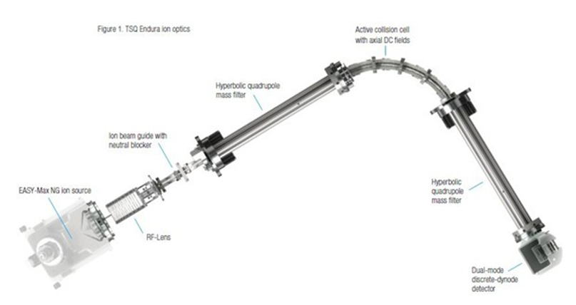 图1展示的是TSQ Endura 整体内部结构图,TSQ Endura 从离子源到传输部件到质量分析器和检测器都有全新的设计,下面就这几个关键部件一一介绍其独有的特点: