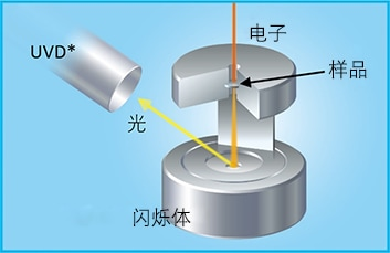 采用高感度低真空二次电子检测器(UVD)。通过检测由于电子线与残留气体分子之间的碰撞而产生的光,可以观察带有二次电子信息的图像。此外,通过控制该检测器,来检测电子照射所产生的光,可以获得CL信息(UVD-CL:带有CL信息的图像)。