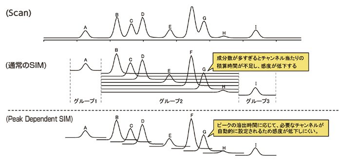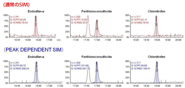 PEAK DEPENDENT SIM条件下的灵敏度是通常的SIM条件下获得的灵敏度的2.4~5.5倍(3种农药成份对比)。