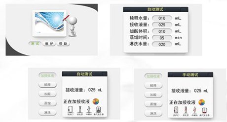 仪器内置氮吹装置并实时显示和调节氮气流量;内置校准功能,可随时对稀释水、接收液、盐酸溶液、淋洗水进行校准;高精度加液泵自动完成接收液、蒸馏水、盐酸溶液的自动加注工作,避免人工加注引起的危险和误差。