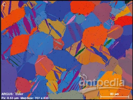 图片说明:(A)PECSII 抛光的样品表面的二次电子像,显示出高度孪晶的晶粒(B)PECSII抛光后的锆合金的菊池花样(C)EBSD欧拉角分布图(D)IPFZ面分而战。照片由牛津大学材料学院AngusWilkin-son 教授和Hamidreza Abdolvand 博士提供。数据是在配有BrukerQuantax EBSD系统的Zeiss Merlin Compact扫描电镜上采集