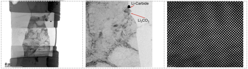 如果希望对锂金属进行原子尺度的表征,需要进行TEM样品制备。传统的Ga离子在室温下会与锂金属发生反应,难以用于锂金属的加工。Thermo Scientific研发的氙气等离子气体源的PFIB(Plasma FIB)可以实现锂金属透射样品的无损制备。为了避免锂金属暴露在空气中造成表面氧化,使用了CleanConnect进行样品传输,随后使用Cryo-PFIB技术进行样品冷冻制备和进一步的观察。图6是利用Cryo-PFIB技术在-178℃进行锂金属样品的TEM样品制备过程以及在TEM中观察到的样品形貌信息。图7TEM明场像中可以看到Li的碳化物与Li2CO3的分布,利用高分辨成像可以看到清晰的锂原子排列,可见在切割和转移过程中样品并未受到损伤或氧化。