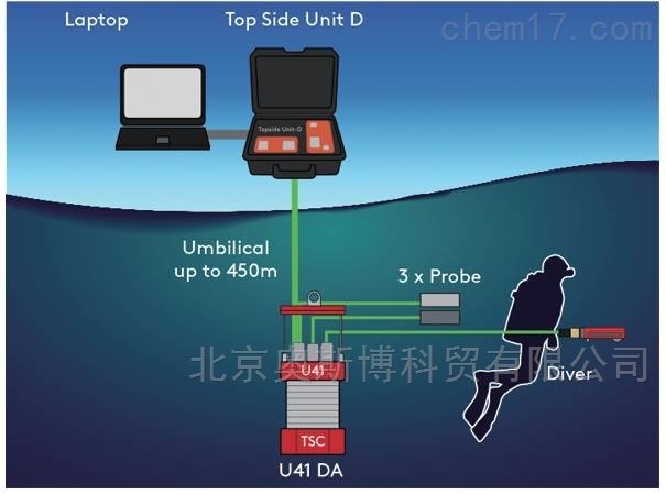 潜水员操作—在固定平台、船舶或饱和潜水钟。将水下机降至与潜水员齐平,潜水员使用的探头通过5米电缆连接到水下机。水下机与水面机之间的脐带电缆,为水下机提供电源、VDSL通讯,和连接的控制笔记本电脑通过以太网进行通信。脐带标配150米,两端有水下连接器。三个脐带可以连接在一起,总长度为450米。水下脐带通过15米甲板脐带连接并放置在潜水控制室的水面单元(ACFM水面操作员位置)。潜水员可使用简单的Bx / Bz探头或迷你(8通道)阵列(探头需要DA版本)。