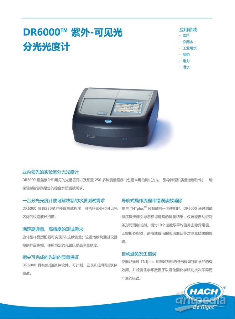 ● DR6000紫外分光光度计,预置250多种测量程序,可对TOC、重金属和营养盐等多种参数进行测量(可测量参数请参考HACH水质分析仪器实验室及便携式仪器卷17页表6《哈希分光光度计及比色计测量参数列表》),帮助用户节省时间。
