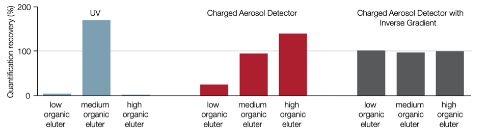 对于梯度分离,利用 CAD 定量回收未知化合物的较佳方法是使用反梯度法洗脱条件。采用标准 CAD 时,定量回收率取决于有机物含量。紫外线检测的回收率取决于分析物的消光系数。